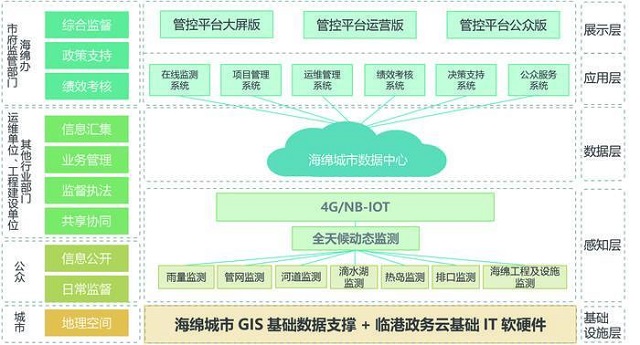 臨港海綿城市智慧管控平臺,集硬件監測設備和軟件系統為一身,包括集成站、岸邊站、管網流量計、雨量計、在線監測系統、項目管理系統、運維管理系統、績效考核系統、決策支持系統、公眾服務系統等。管控平臺在系統建設過程中融合“水彈性城市”理念,主要使用物聯網、大數據、云計算等新一代信息化技術,以云計算虛擬化平臺為基礎,以海綿城市數據中心為核心,結合GIS(地理信息系統)+物聯感知網絡構建海綿城市智慧管控平臺,多角度全方位實時監測海綿城市建設過程及運行情況,通過多源數據融合技術及數據分析技術,實現對海綿城市從規劃建設到運行管理的閉環精準管理,實現海綿城市各區域、各部門、各系統、各設施的高效聯動,讓海綿城市功能得到充分、長效的發揮。