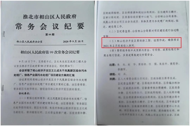 偏偏相山區(qū)一點也不急,嘴上喊著已經(jīng)在走流程了,其實是2020年9月才研究部署食品工業(yè)園污水處理廠建設工作,并且相關工作僅停留在文件上,直至本次督察進駐前夕,相山區(qū)才再次啟動污水處理廠的建設工作,目前尚處于項目土地報批階段。