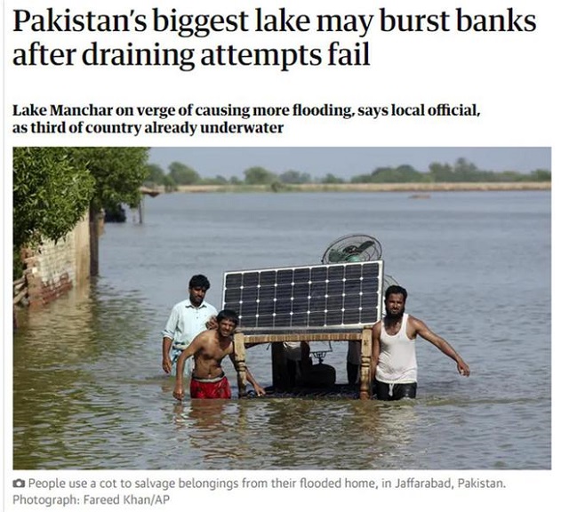 報(bào)道稱,為避免造成更大損害,政府官員們已于周日(當(dāng)?shù)貢r(shí)間9月4日)對(duì)曼查爾湖采取泄洪措施。他們表示,雖然此舉可能會(huì)使10萬人被迫離開家園,但同時(shí)也會(huì)讓人口更稠密的地區(qū)免遭洪水侵襲。