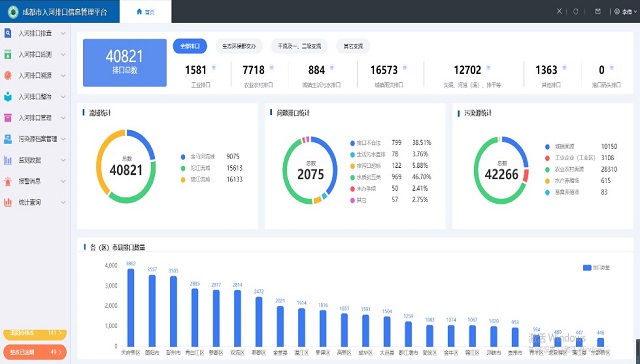 PC端的“成都市入河排口信息管理平臺”則主要用于后臺信息管理,包括數(shù)據(jù)審核、統(tǒng)計分析、問題調(diào)度等,面向各級行政管理人員和數(shù)據(jù)審核人員。除記錄排口信息、周邊環(huán)境、水質(zhì)水量等數(shù)據(jù)外,還能利用大數(shù)據(jù)平臺實現(xiàn)排污口信息的整體呈現(xiàn)和入河排污口“一張圖”管理,便于分區(qū)域、分類別整治排污口,因口施策。