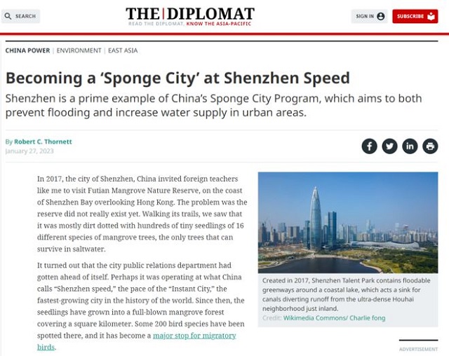 近日,國際知名的“外交學者”網站(The Diplomat )發表了一篇文章——《以深圳速度成為“海綿城市”》(Becoming a ‘Sponge City’ at Shenzhen Speed),關注中國海綿城市建設。該報道出自一位美國作家、高校講師羅伯特·索尼特(Robert C. Thornett)之手。作者曾經到訪深圳參觀過福田紅樹林自然保護區,作者也從多個具體的例子切入講述海綿城市在深圳的具體實踐。