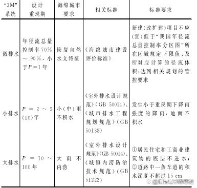 內澇成因復雜,解決內澇必須從問題產生的根源著手,運用滯、蓄、排等技術手段,充分發揮基于海綿城市理念的“3M”系統效能,綜合治理(見表1)。源頭減排系統旨在恢復場地開發前自然水文特征,應對低強度大概率(一般在1年一遇重現期以下)的中小降雨事件;小排水系統重點解決及時排除短時強降雨帶來的徑流量劇增,應對較大概率的短歷時強降雨事件,一般在2——10年一遇降雨條件下達到“地面無積水”;大排水系統重點是對超標徑流進行合理蓄、排,應對小概率的超強降雨 事 件,一般在10——100年一遇降雨條件下,滿足“大雨不內澇”。海綿城市理論的系統性要求“3M”各系統之間在規劃設計、標準應用、豎向控制等方面做好充分銜接,綜合發揮效能,應對水生態與水安全問題。