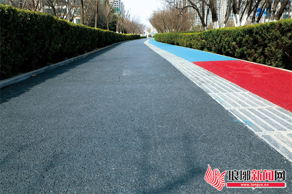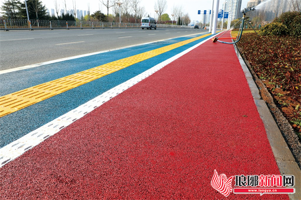 武漢路(蒙河路-沂蒙路)人行道改造工程全長400米,寬3米,面積1200平方米。工程采用透水混凝土工藝進行鋪設,結構層為10厘米透水混凝土基層加5厘米彩色透水混凝土面層,有效提高城市道路的雨水滲透能力、高散熱性能和景觀功能。