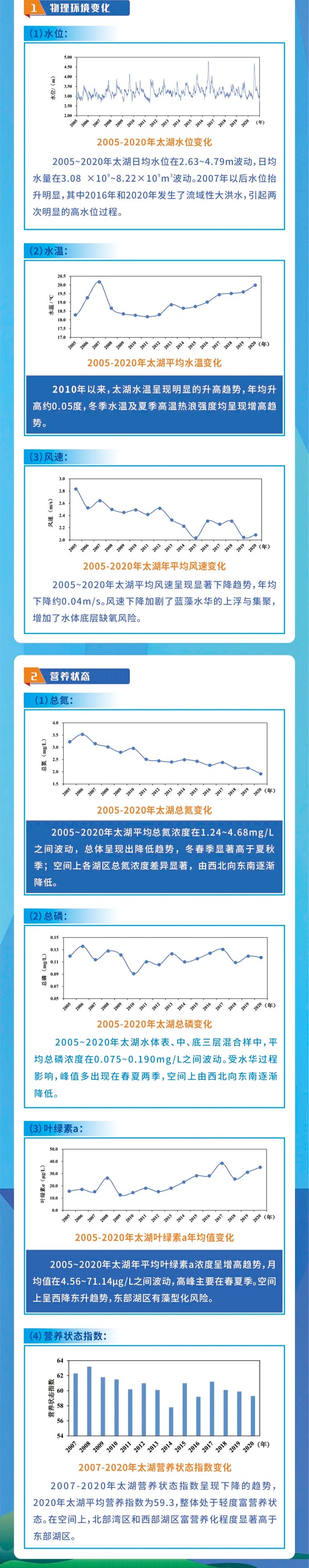 15年間,太湖物理環境變化顯著。其中水位變化方面,2005——2020年間,太湖日均水位在2.63——4.79m波動,日均水量在3.08×10?~8.22×10?m3波動。2007年以后水位抬升明顯,其中2016年和2020年發生了流域性大洪水,引起兩次明顯的高水位過程;平均水溫變化方面,2010年以來,太湖水溫呈現明顯的升高趨勢,年均升高約0.05℃,冬季水溫及夏季高溫熱浪強度均呈現增高趨勢;平均風速變化方面,2005——2020年太湖平均風速呈現顯著下降趨勢,年均下降約0.04m/s。風速下降加劇了藍藻水華的上浮與集聚,增加了水體底層缺氧風險。