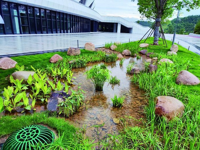 項目作為大型公共建筑,綠化灌溉和道路沖洗用水需求大。為減少自來水使用量,項目積極探索應用智能化雨水回收利用系統。雨季利用建成的各類海綿設施,將雨水收集調蓄凈化后,通過自動化系統實現系統的智能運行,回用于場地綠化澆灌和道路沖洗,極大地節省了水資源。