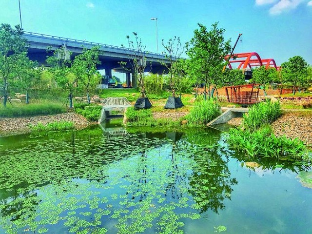 “海綿+”助力解決民生痛點(diǎn) 寅春路立交鐵路涵洞一到汛期就容易產(chǎn)生積淹水,給行人、車輛帶來極大的困擾。為解決積淹水問題,項(xiàng)目采用“海綿+積淹水點(diǎn)整治”的設(shè)計(jì)思路,堅(jiān)持“源頭減排、過程控制、系統(tǒng)治理”的技術(shù)路線,對(duì)涵洞附近的涂家營(yíng)溝河道進(jìn)行改造,提高區(qū)域整體排水能力。改建涵洞附近現(xiàn)有的市政雨水管,以保障積淹水點(diǎn)排水通暢。此外,公園附近的高架雨水經(jīng)斷接消能處理后,與涵洞內(nèi)雨水一起匯入公園雨水濕地、調(diào)蓄水體、旱溪等海綿設(shè)施內(nèi),在整治積淹水點(diǎn)的同時(shí),解決路面雨水污染問題。