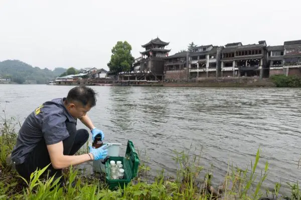 成都市生態環境監測中心站現場監測人員在錦江黃龍溪古鎮段提取水樣。資料照片