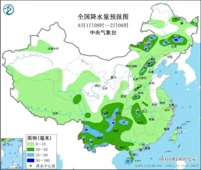 中央氣象臺預計,8月1日白天到夜間,京津冀等地強降雨明顯減弱,但河北中西部和北部沿山地區、北京、天津北部以及河南北部和西部、四川東部和南部、貴州、云南等地部分地區有中到大雨,河北北部、北京西部沿山地區及吉林北部、四川東南部、云南西北部等地有分散性暴雨(50——70毫米)。上述部分地區伴有短時強降水(最大小時降雨量30——50毫米,局地可超過60毫米),黑龍江西北部等地的局地將有雷暴大風或冰雹天氣。