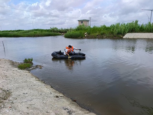 圖為太湖東海局監測與科研中心工作人員乘皮劃艇搭載側掃聲吶排查水下排污口