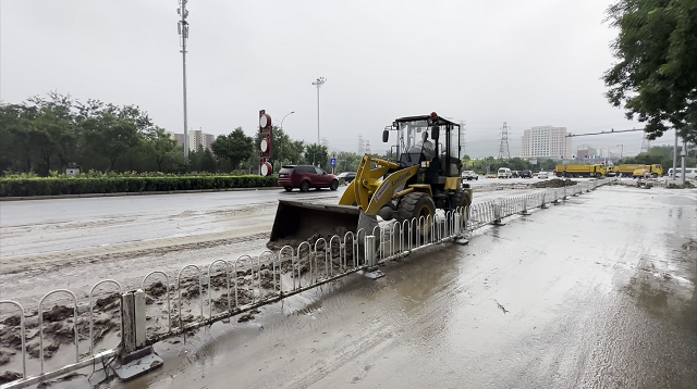 現場,北京環(huán)衛(wèi)集團的相關人員正抓緊對這些淤積泥沙進行清理。在公路上,大型鏟車、多功能作業(yè)利用車前的刮板,把淤泥鏟起并堆積起來,再用大型清運車輛拉走后進行沖洗作業(yè)。而在人行道上,工作人員主要通過人工作業(yè),利用鐵鍬等工具將路面清理干凈。