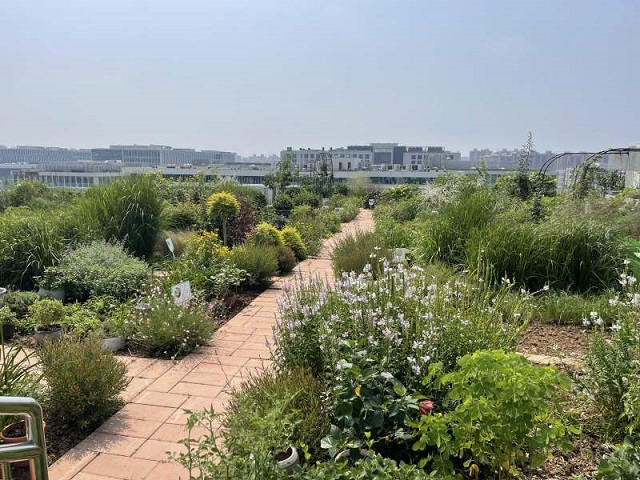 記者在園區(qū)看到,不僅花園、下凹式綠地能“吸水”,寫字樓的屋頂也是大“海綿”,不少企業(yè)在屋頂栽種了綠植,一家幼兒園還將屋頂改造成花園、菜園,孩子們多了親近大自然的空間,下雨天綠色的屋頂還能起到收納雨水的作用。
