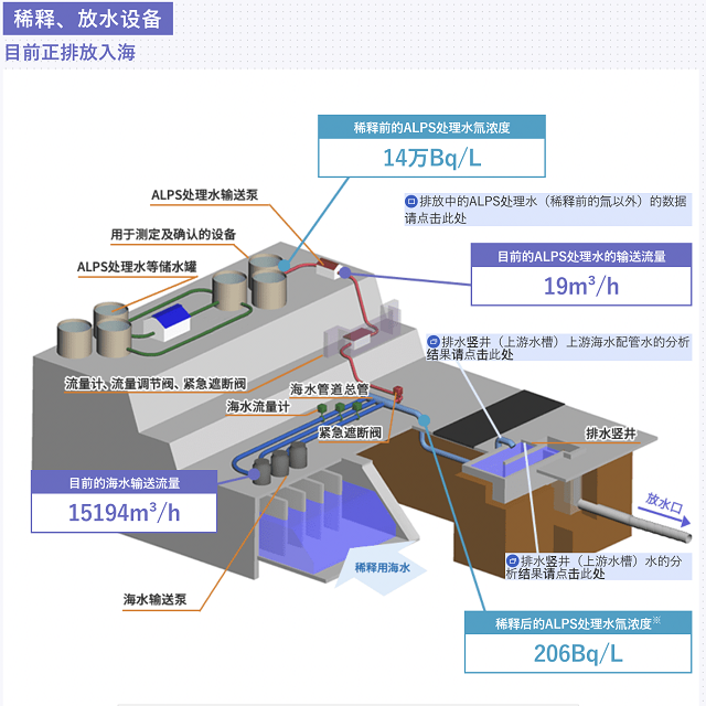 當地時間8月29日21時的實時數據顯示,所謂“ALPS處理水”以每小時19立方米的速率流出管道,另一邊用于稀釋氚的海水以每小時15194立方米的速率流出,與“ALPS處理水”匯集,一同流向排水豎井,最終入海的核污水中氚濃度檢測值為206貝克勒爾/升。世衛組織2017年發布的《飲用水質量標準》規定,飲用水中氚的含量不得超過10000貝克勒爾/升。