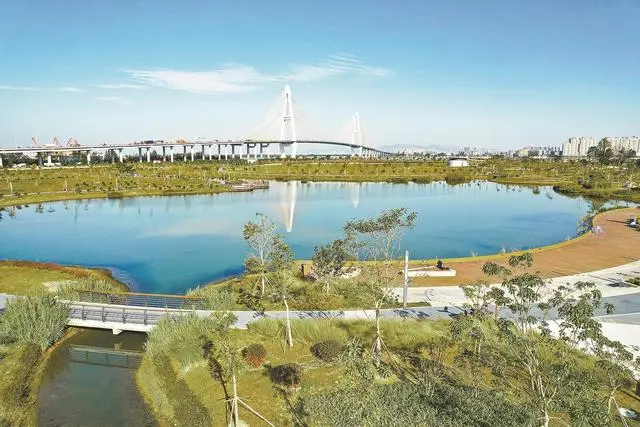 步移景異,一步一景。記者沿著園內的瀝青路漫步而行,在中心湖區看到,該區域以榕樹為主要遮陰樹種,搭配紅花玉蕊等觀花樹種,形成靜謐的湖區植物空間。濕地花海以千屈菜、梭魚草等水生濕生植物為主,打造生態野趣、色彩繽紛的濕地植物景觀。步行至觀海長廊,以銀海棗、紅花玉蕊等植物為主,搭配粉黛亂子草、小兔子狼尾草等觀賞草,別具南亞熱帶濱海特色的生態景觀岸線在眼前徐徐展開。