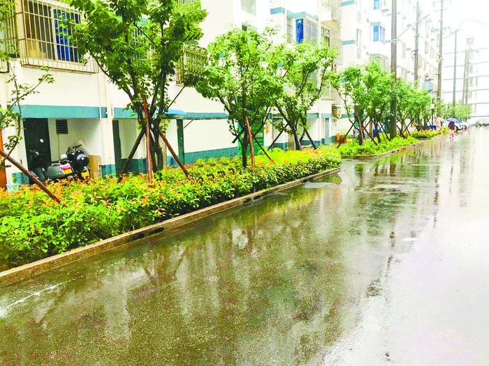 景觀工程以提升人居環境為主,讓居民走出戶外、增加交流。由于老舊小區內條件有限,海綿設施選取易維護、效果好的技術措施,在主干道一側采用改良型的線性雨水花園,收集主干道和部分屋頂雨水并進行有組織的滯蓄,建筑屋面雨水和道路徑流雨水通過雨落管斷接、開孔側石進入雨水花園。通過更換雨水花園內原有的種植土層,重構綠地系統,小雨時雨水經過濾層凈化后滲透至溝底的盲管排入雨水管道,大雨時雨水通過設置在雨水花園內的溢流井溢流至小區排水系統。植物搭配方面,優先選用本土植物,在種植策略上選擇常綠、耐淹、耐旱、耐污、耐寒等多重要求的植物,營造出良好的自然生態植物景觀群落。