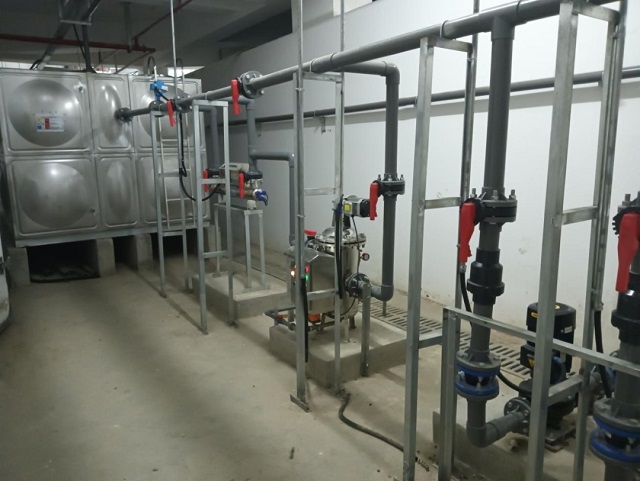 建筑內(nèi),也“別有洞天”——設(shè)置雨水回收系統(tǒng),收集屋面及道路雨水后,采用“就地預(yù)處理單元+生化處理系統(tǒng)”工藝將凈化后的雨水輸送到清水箱中,用于場(chǎng)地內(nèi)綠化的澆灌,以“水循環(huán)”實(shí)現(xiàn)水資源高效利用。