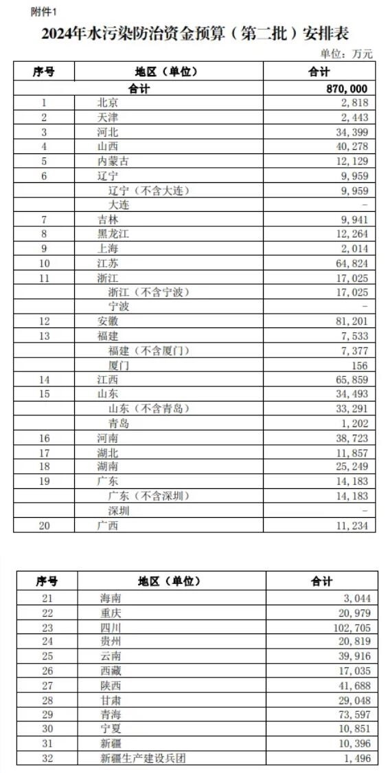 日前,財政部集中下達2024年多項生態環保相關資金預算。此前已經下達生態環保修復預算和節能減排預算等。最近,2024年水污染防治、大氣污染防治、農村環境整治等資金預算也陸續下達,這三筆預算分別為87億、109億和20億,水污染防治資金預算安排如下:
