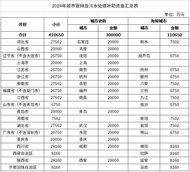 一、下達你省(區、市)2024年城市管網及污水處理補助資金預算指標(項目編碼10000013Z135060079040),用于支持系統化全域推進海綿城市建設示范、實施城市更新行動。具體預算金額見附件。支出列2024年政府收支分類科目“211.節能環保支出”。