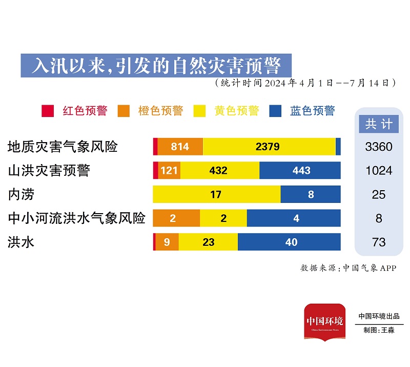 僅在6月份,南方地區經歷了多輪強降雨天氣過程,中央氣象臺從6月10日開始連續21天發布暴雨預警,其中4天發布了最高級別的暴雨紅色預警。全國共發布紅色預警信息1969條,其中暴雨紅色預警信息占全部的45.7%,同比增加61.1%。
