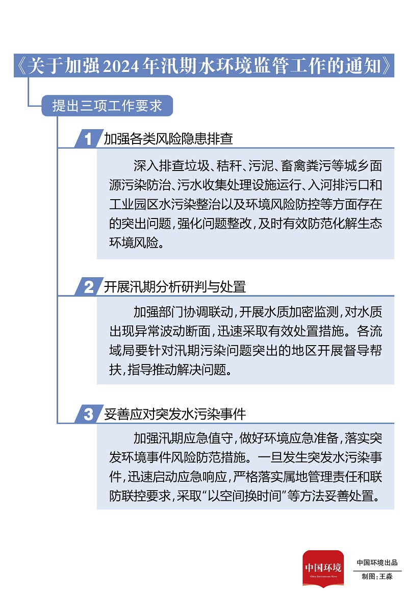 同時,極端降水對于環境風險防控工作帶來不小的挑戰和壓力。目前,生態環境部對汛期環境監管和突發環境事件應對作出安排部署,印發《關于加強2024年汛期水環境監管工作的通知》,要求各地進一步加強汛期水環境監管,防范汛期水環境質量惡化以及發生重大水污染事件,切實保障飲水安全。生態環境部生態環境應急辦主任李天威表示,明確要求各地參考國控斷面歷年汛期水質數據和集中式飲用水水源地水源環境狀況調查評估的情況,確定本行政區域汛期重點關注斷面和飲用水水源地,識別斷面匯水范圍內影響水質以及飲水安全的主要污染源。