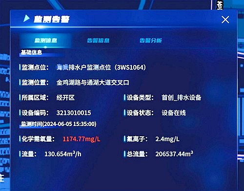 目前,宿遷市已搭建了統一的物聯感知平臺、視頻中臺,打造了國內領先的城市物聯感知體系,實現監測數據的實時匯聚接入、智能處理分析。共完成1.8萬公里基礎管線匯聚治理,累計上報庫表類監管數據49萬余條,燃氣、供水、排水、橋梁實時監測數據8660萬條,同步完成18類約40萬條市級數據共享。系統特色場景應用包括水源地、供水、排澇、污水、城市河道水位水質等城市水務全流程監管,實現燃氣供應端、輸配端、用戶端風險隱患的常態化跟蹤監管,賦能城市生命線安全治理。系統試運行以來,全市共發現隱患點位1467個,布設及安裝智能傳感監測設備1590套,覆蓋中心城市示范區橋梁8座及管線900公里,全面推動傳統基礎設施領域安全生產管理向數字化、智慧化轉型,公共安全治理從“事后被動應對”向“事前主動預防”大步邁進。圖為宿遷市某排水企業水質超標報警信息。