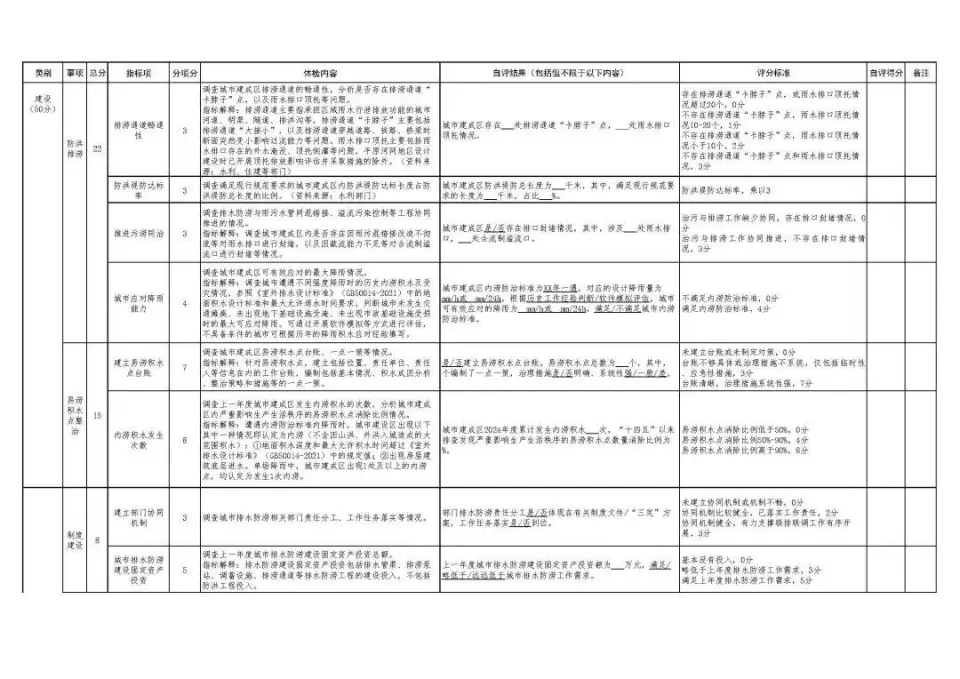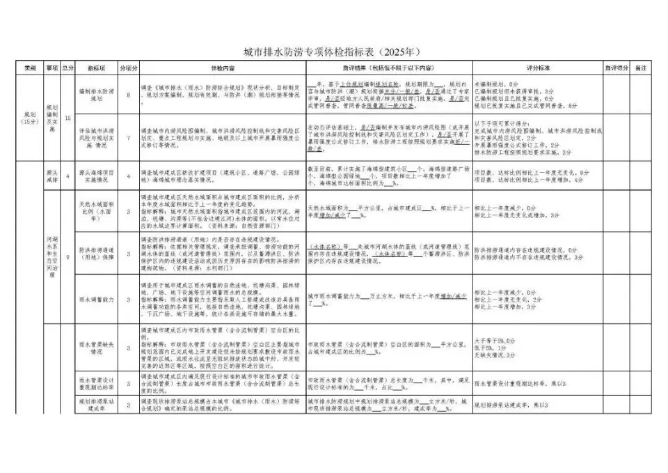 為深入貫徹落實黨中央、國務院決策部署,建立城市內澇治理評估機制,我們在2024年組織開展城市排水防澇專項體檢自評估的基礎上,研究更新了《城市排水防澇專項體檢指標表(2025年)》(見附件,以下簡稱“指標表”),現印發給你們。請你們結合2025年汛前準備、隱患排查等工作,組織開展城市排水防澇專項體檢自評估,全面排查城市防洪排澇體系的問題短板和薄弱環節。專項體檢要覆蓋全部城市(包括地級及以上城市、縣級市,不含下轄縣、鄉、鎮)。針對體檢發現的問題,屬于本部門的,要明確措施和整改時限,持續推進解決;需要相關部門解決的,城市建設(排水)部門要報告屬地政府,及時反饋和移交。