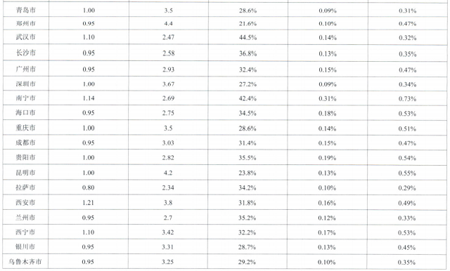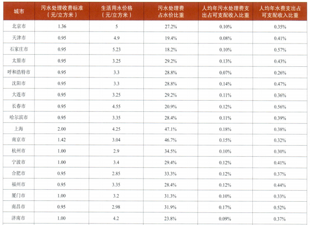 在重點(diǎn)調(diào)研的36個(gè)大、中城市污水處理收費(fèi)標(biāo)準(zhǔn)、居民生活用水價(jià)格(第一階梯)、年人均生活用水量、人均可支配收入等的數(shù)據(jù)基礎(chǔ)上,計(jì)算各城市污水處理費(fèi)有關(guān)占比情況,如表1所示。