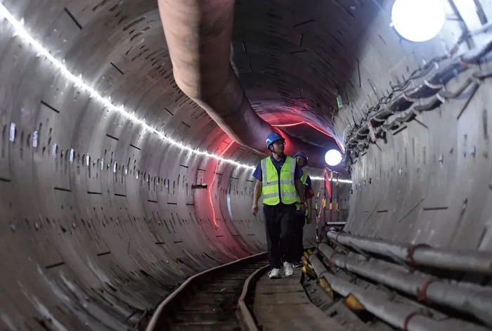 2024年7月30日,由中鐵隧道局承建的天津市濱海新區(qū)雨污分流改造工程項(xiàng)目雨水主管隧道順利貫通。圖為工作人員在雨水主管隧道內(nèi)檢查盾構(gòu)管片