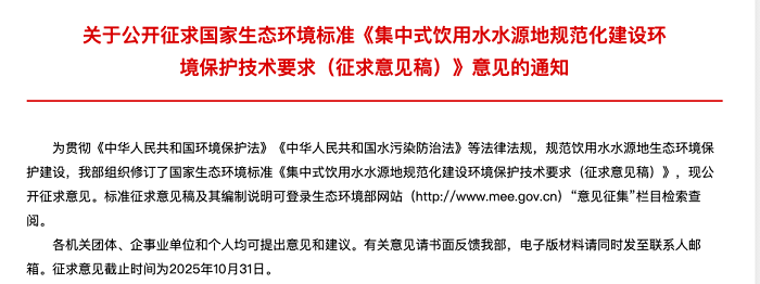 為貫徹《中華人民共和國環(huán)境保護法》《中華人民共和國水污染防治法》,規(guī)范飲用水水源地生態(tài)環(huán)境保護建設(shè),提升水源水質(zhì)安全保障水平,生態(tài)環(huán)境部日前發(fā)布通知,就《集中式飲用水水源地規(guī)范化建設(shè)環(huán)境保護技術(shù)要求(征求意見稿)》(以下簡稱《征求意見稿》)公開征求社會各界意見,意見反饋截止日期為2025年10月31日。