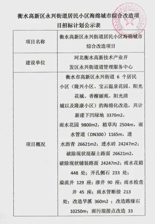 近日,衡水市公共資源交易平臺發布衡水高新區永興街道居民小區海綿城市綜合改造項目招標計劃公示。