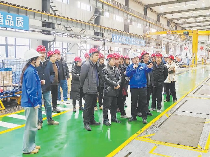 圖為項目組研發骨干和跟蹤指導專家組考察地下水循環井一體化設備柔性生產線。