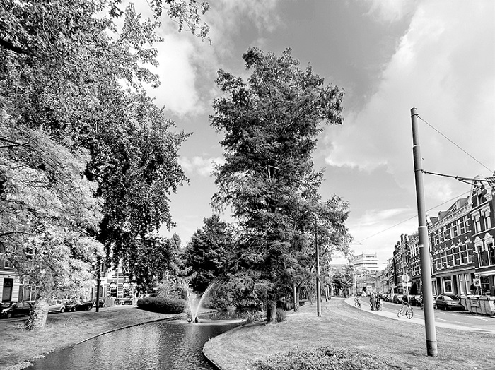 “城市熱島效應(yīng)”日益加劇,在市中心和老城區(qū)尤為明顯,成為鹿特丹迫切需要應(yīng)對的氣候挑戰(zhàn)。為此,鹿特丹通過一系列景觀策略為城市降溫,核心舉措是系統(tǒng)性增加“涼爽場所”——面積超過200平方米、炎熱時(shí)體感溫度能維持在38℃以下的公共空間。市政府與迪弗科托景觀事務(wù)所共同繪制“涼爽場所地圖”與“距離地圖”,評估現(xiàn)有涼爽空間分布,識別距離居民區(qū)超過300米(即世界衛(wèi)生組織建議標(biāo)準(zhǔn))的服務(wù)盲區(qū),重點(diǎn)關(guān)注市中心、老城區(qū)及部分新建社區(qū)。為實(shí)現(xiàn)降溫目標(biāo),鹿特丹采用綜合性景觀干預(yù)方案:增種樹木和設(shè)置遮陽篷提供蔭涼;利用噴泉與植被增強(qiáng)蒸發(fā)冷卻效應(yīng);采用淺色鋪裝及增加綠化減少地表熱量吸收;結(jié)合水體景觀直接降溫;增設(shè)街道家具、提升步行空間品質(zhì),激活未被充分利用的區(qū)域。這些措施被整合進(jìn)覆蓋全市38個(gè)街區(qū)的“涼爽公共空間機(jī)會(huì)地圖”,將降溫策略與城市更新項(xiàng)目緊密結(jié)合,優(yōu)先改善服務(wù)不足的區(qū)域。