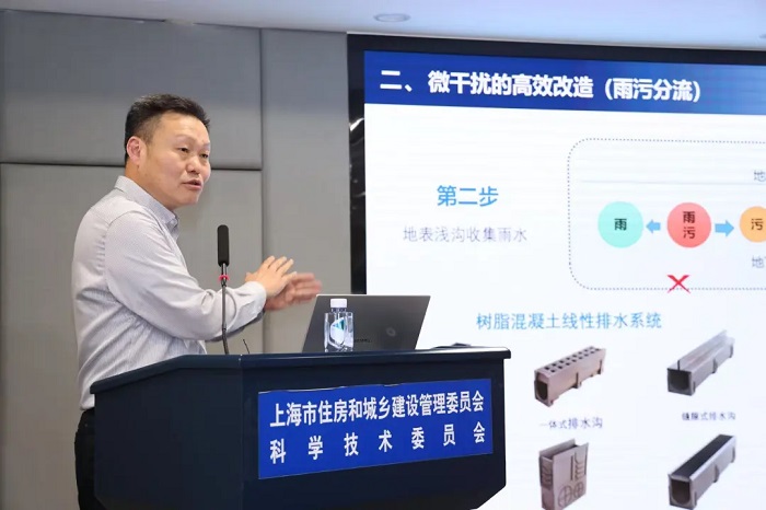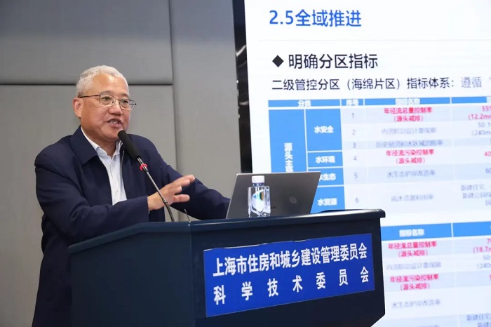 海綿城市建設是城市尺度的系統(tǒng)工程,需要多專業(yè)協(xié)同。全國工程勘察設計大師、海綿城市建設工程技術創(chuàng)新中心主任張辰在會上首先系統(tǒng)闡述了全域海綿城市建設的技術邏輯、實施路徑與長效機制。在介紹上海“十四五”海綿城市建設取得的顯著成效時,他詳細解讀了2030年新增450平方公里達標區(qū)等目標規(guī)劃,以及四類管控分區(qū)的差異化指標制定,并分享了通過源頭減排、過程控制、系統(tǒng)治理全鏈條推進的多個海綿改造實例,為超大城市海綿城市建設提供了權威技術示范。